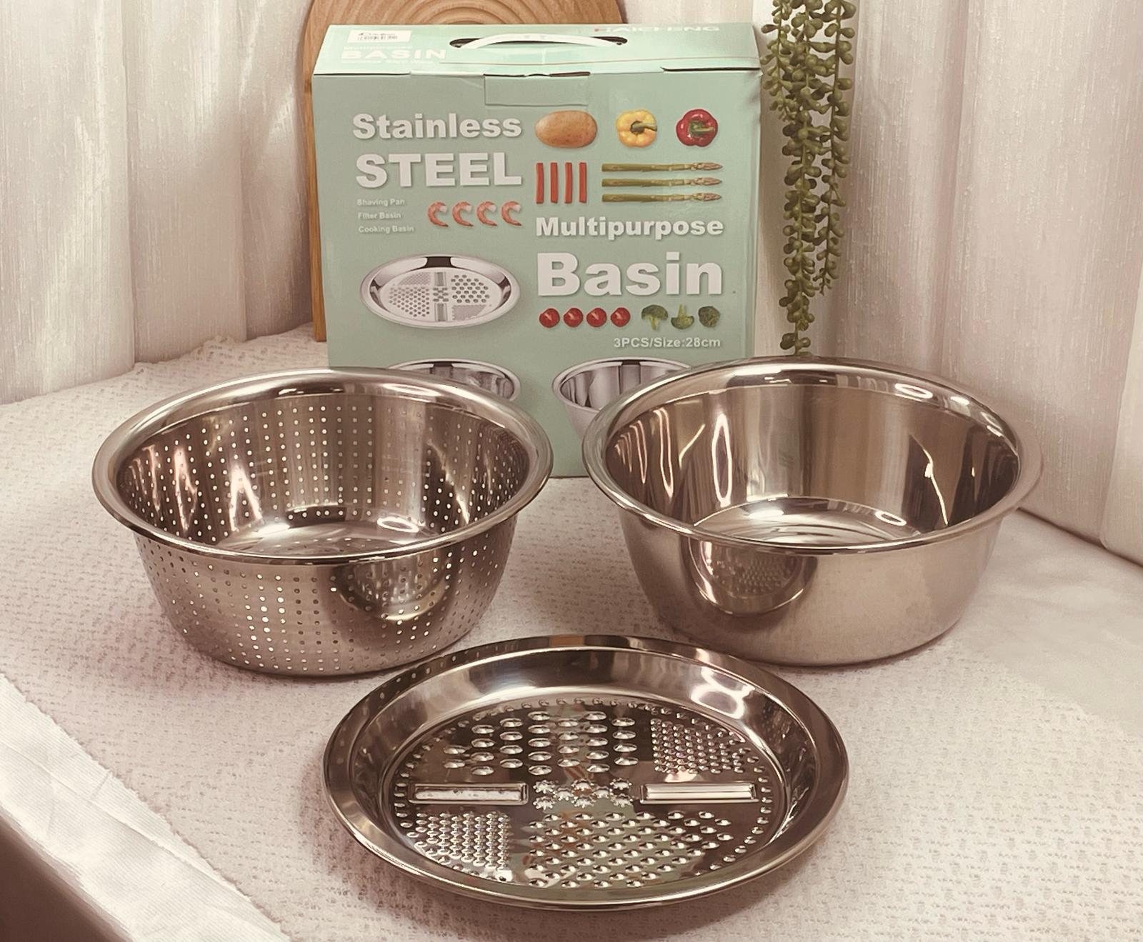 طقم لجن 3 قطع ستاتلس ستيل + مصفاة + لوح برش حجم 28 سم