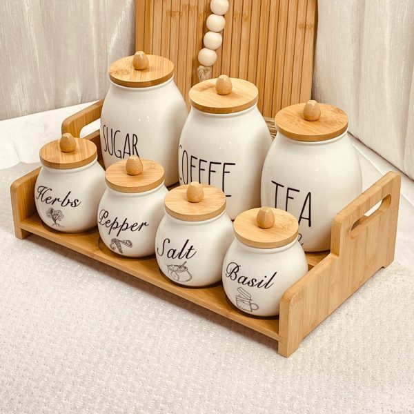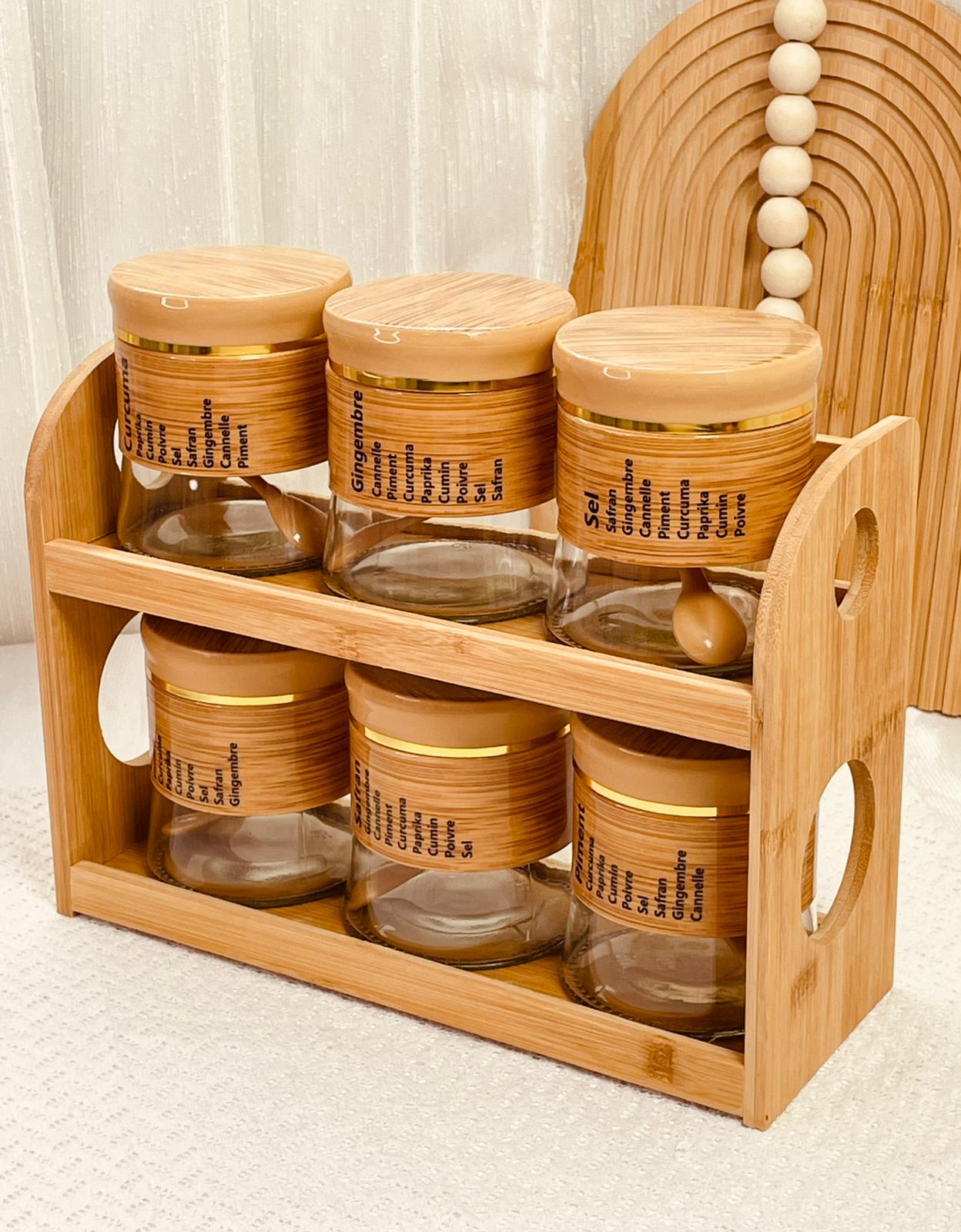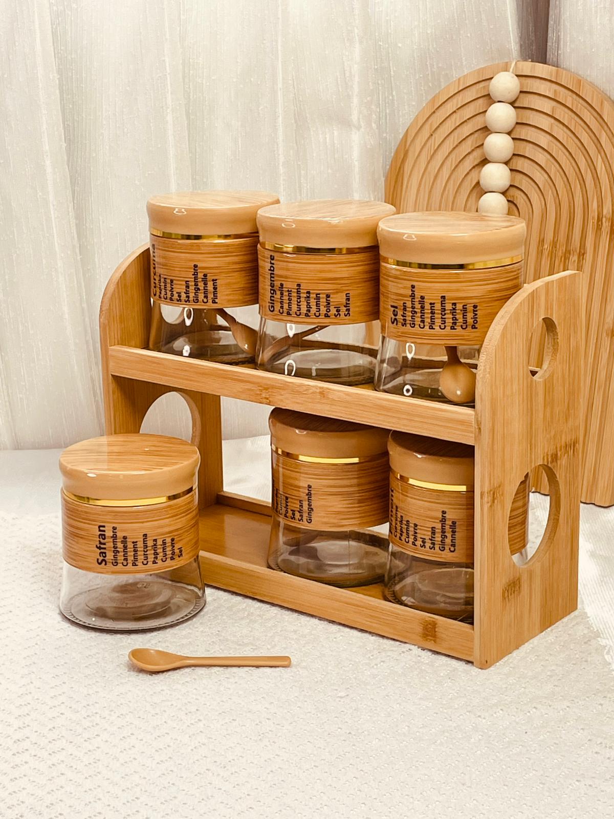 طقم 6 علب بهار زجاج + 6 معالق ستاند خشب بامبو
