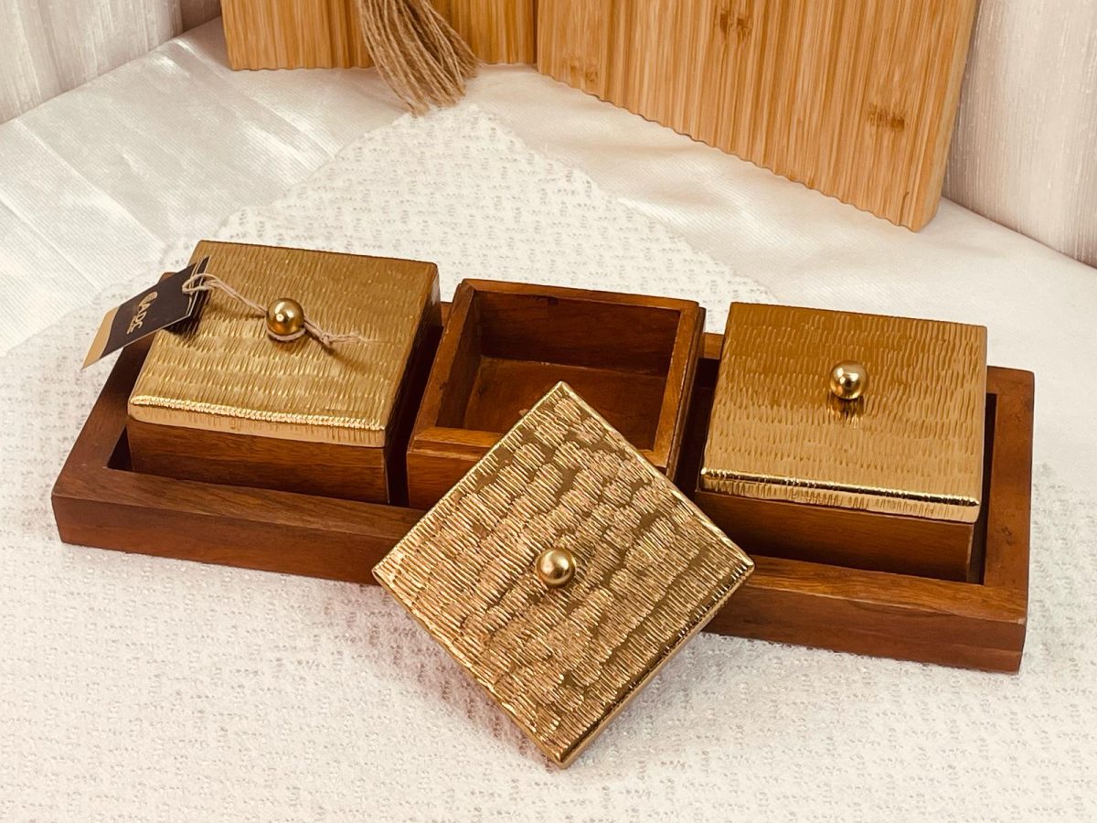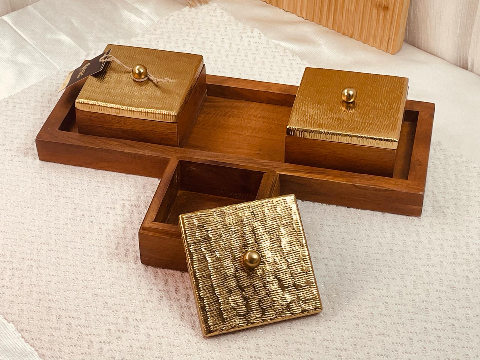 طقم مضايف قاعدة خشب هندي غطا نحاس هندي 4 قطع
