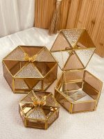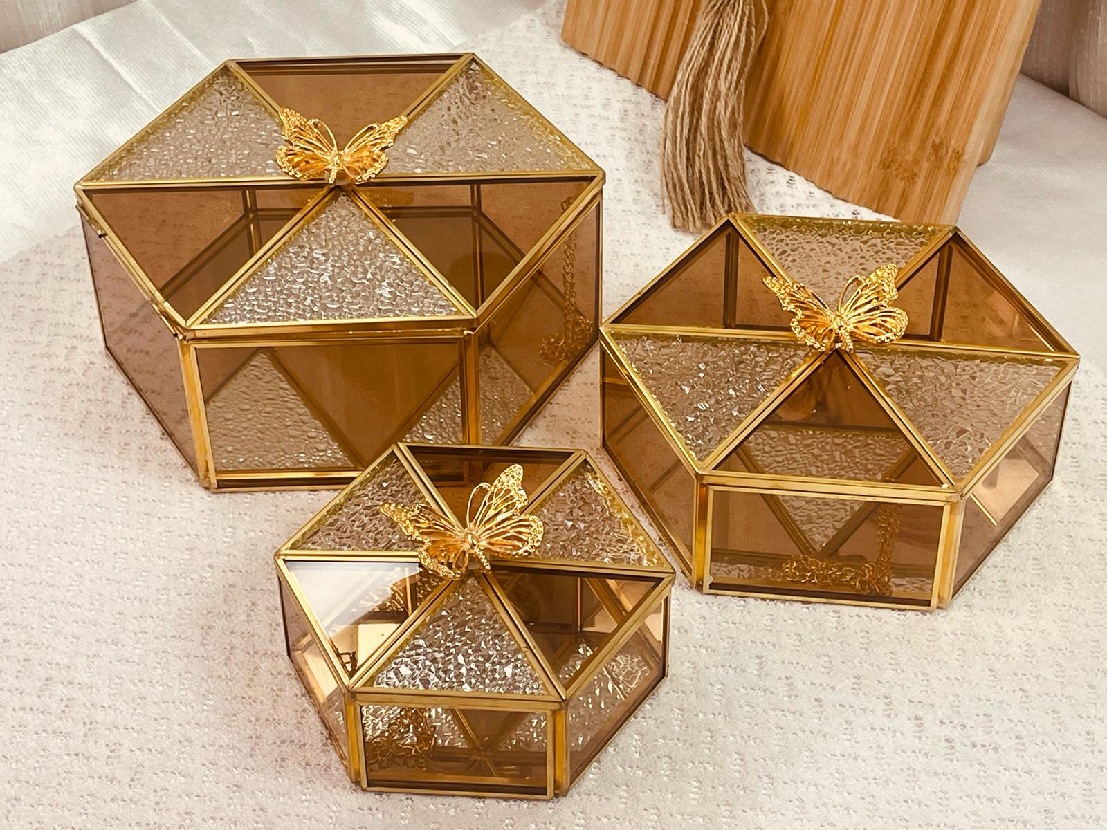 طقم مضايف كرستال عسلي مع غطا ممسك فراشة( يمكن بيع قطع فردية)